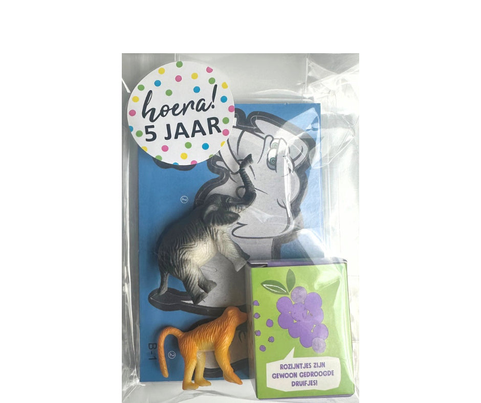 Alles is netjes ingepakt in glanzend cellofaan, afgewerkt met een feestelijke traktatiesticker. Kies zelf de leeftijd die erop komt te staan.