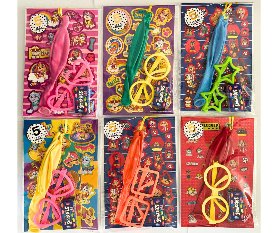 -Stickervel met Paw Patrol stickers er op. In de traktaties vind je een gevarieerd assortiment stickervellen (in meerdere kleuren) , wat een vrolijk geheel maakt.Ā