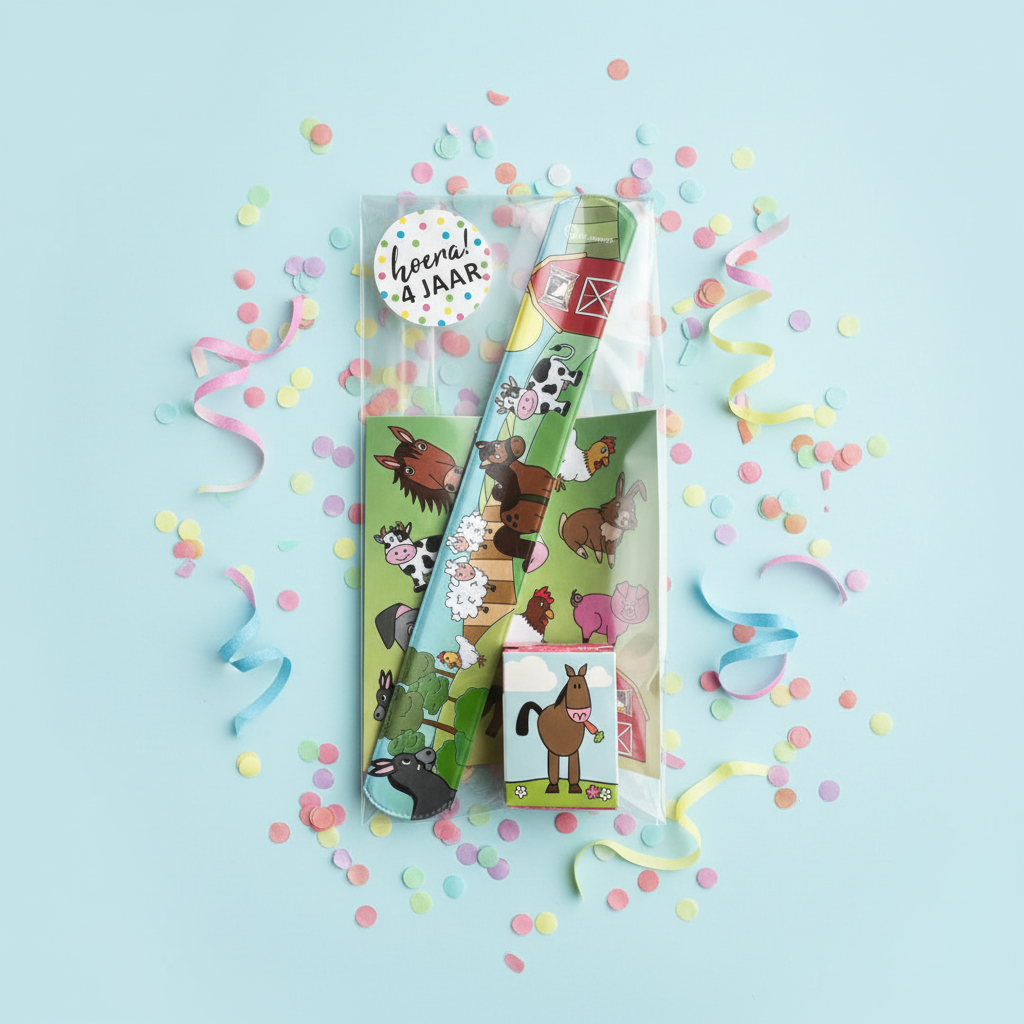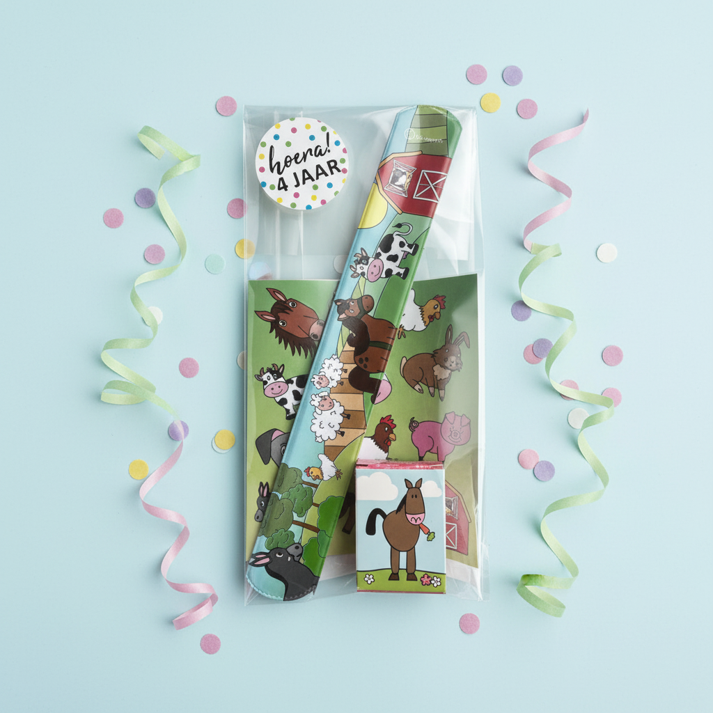 De traktatie wordt ingepakt in cellofaan met daarop een traktatiesticker met leeftijd naar keuze.