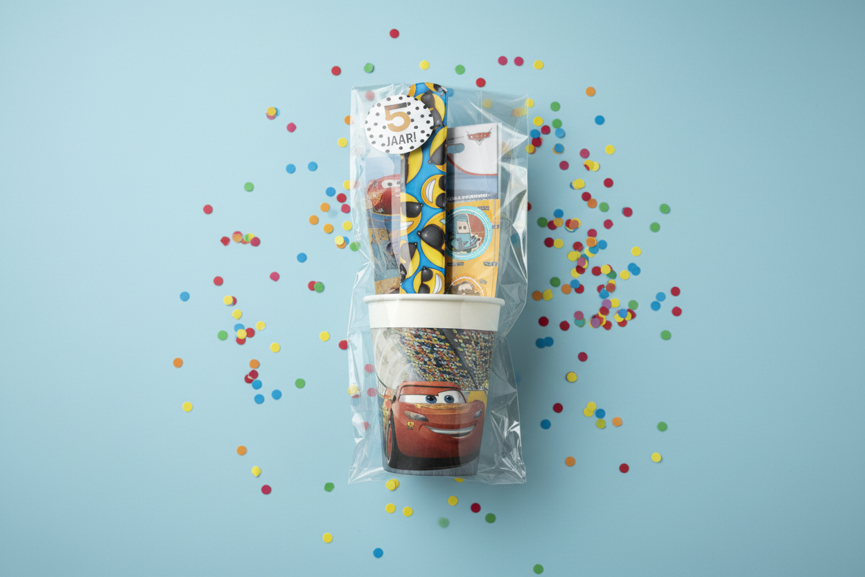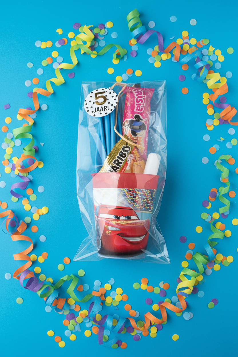 De traktatie wordt ingepakt in cellofaan met daarop een traktatiesticker met leeftijd naar keuze.