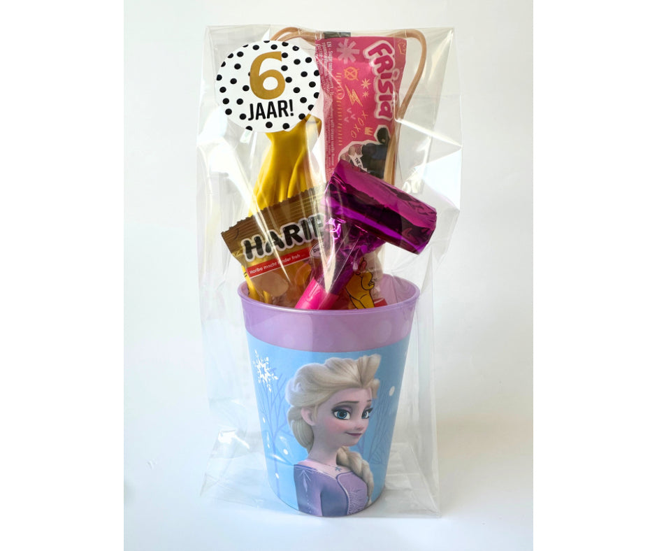 Alles wordt netjes ingepakt in transparante folie en krijgt een traktatiesticker (met leeftijd) naar keuze.